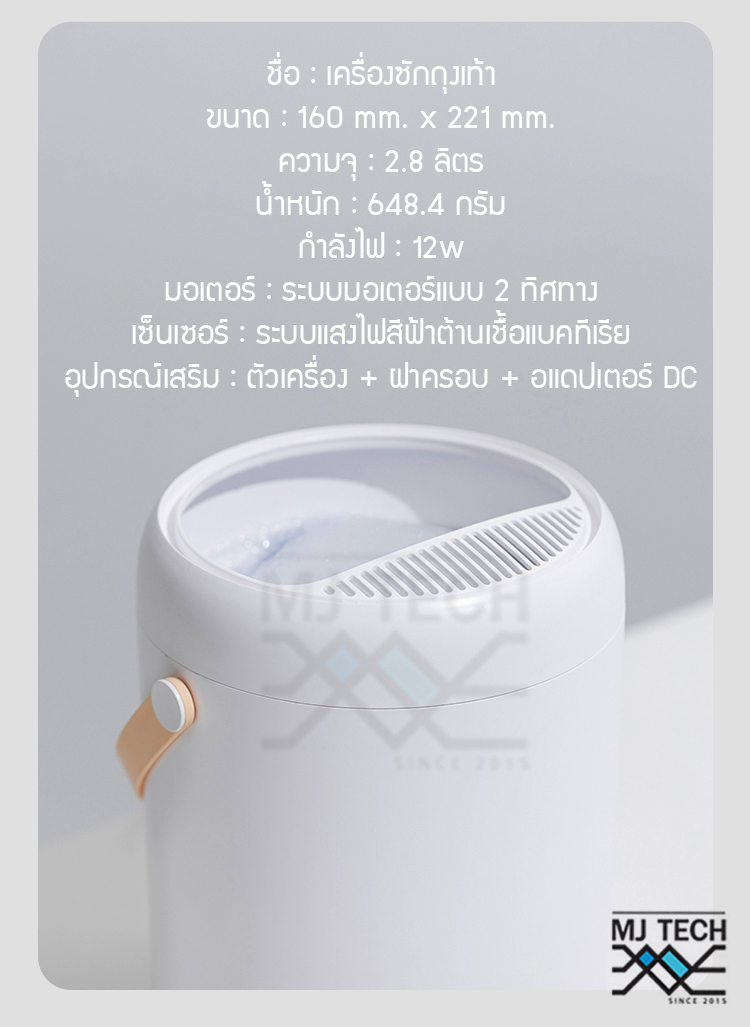 ข้อมูลผลิตภัณฑ์ ชื่อสินค้า : เครื่องซักผ้าแบบพกพา สีสินค้า : ขาว, ฟ้า, เขียว ขนาดผลิตภัณฑ์ : 17 x 16 x 22 cm. ขนาดบรรจุภัณฑ์ : 17.5 x 17 x 23.4 cm. น้ำหนักสุทธิผลิตภัณฑ์: 648.4 g. น้ำหนักรวมผลิตภัณฑ์: 881 g. ความจุ : 2.8 ลิตร กำลังไฟ : 12 w มอเตอร์ : ระบบมอเตอร์แบบ 2 ทิศทาง เซ็นเซอร์ : ระบบแสงไฟสีฟ้าต้านเชื้อแบคทีเรีย วัสดุผลิตภัณฑ์ : ABS อุปกรณ์เสริม : ตัวเครื่อง + ฝาครอบ + อะแดปเตอร์ DC คุณสมบัติ - เครื่องซักผ้าตั้งโต๊ะแบบพกพา สำหรับซักผ้าที่มีน้ำหนักเบา เช่น เนคไท, ถุงเท้า, ชุดชั้นใน เป็นต้น - สวิตซ์แบบสัมผัส - ประหยัดน้ำ และช่วยถนอมผ้าให้สวยงาม - สะดวกในการซักผ้าชิ้นเล็ก - ซักผ้าได้อย่างรวดเร็วเพียง 15 นาที - ระบบฆ่าเชื้อด้วยแสงไฟสีฟ้าต้านเชื้อแบคทีเรีย - น้ำหนักเบา ใช้งานง่าย ขนาดกะทัดรัด เหมาะสำหรับเดินทาง หรือใช้ในบ้าน - ใช้เทคโนโลยีมอเตอร์แบบ 2 ทิศทาง ช่วยให้ทำความสะอาดได้อย่างสะอาดล้ำลึก - ไม่เหมาะสำหรับกางเกงยีนส์ เสื้อโค้ท และเสื้อผ้าหนักอื่นๆ ![]() ![]() ![]() ![]() ![]() ![]() ![]() ![]() ![]() ![]() ![]() ![]() ![]() ![]() |